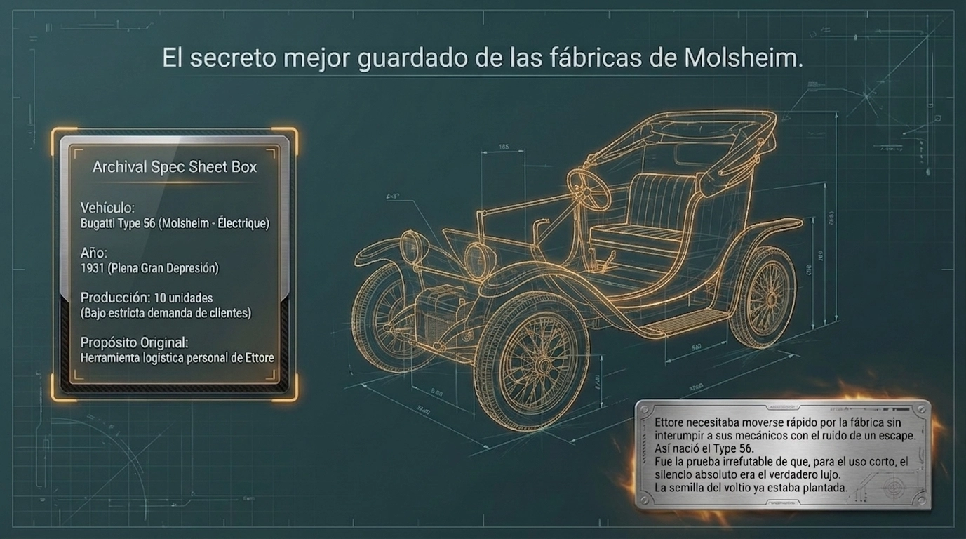 El Bugatti Type 56 no era un hiperdeportivo para ganar en Le Mans. Era un pequeño vehículo eléctrico de un solo asiento, con un diseño que recordaba a un carruaje victoriano sin caballos. ¿Por qué lo hizo? Simple: Ettore necesitaba moverse por las vastas instalaciones de su fábrica de Molsheim de forma rápida y, sobre todo, silenciosa. No quería interrumpir la concentración de sus mecánicos con el estruendo de un escape.