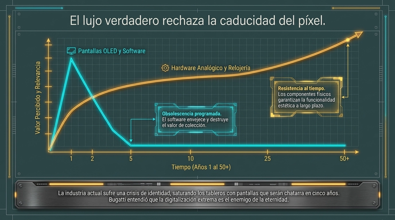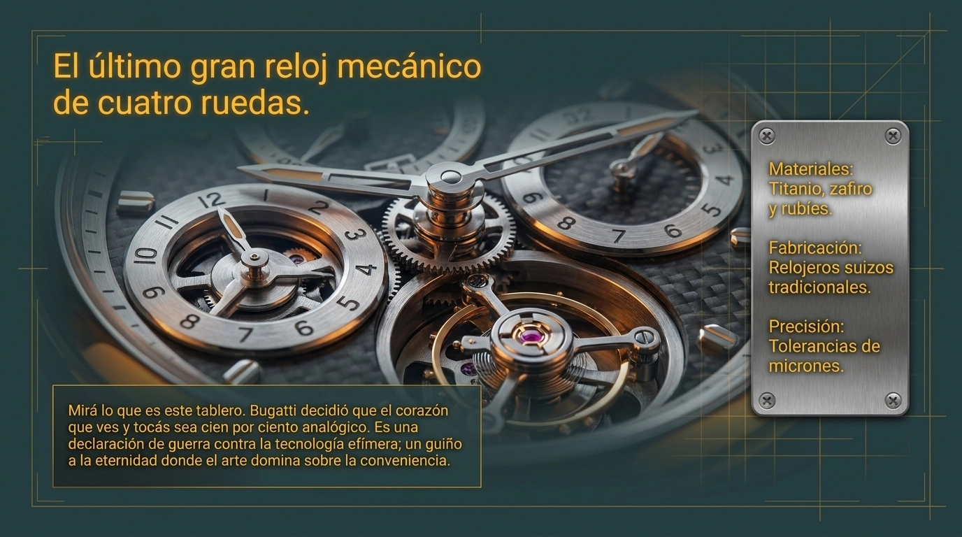 En un mundo saturado de pantallas OLED que quedan obsoletas en cinco años, Bugatti decidió que el instrumental del Tourbillon fuera relojería mecánica pura, fabricada por relojeros suizos con tolerancias de micrones. Es un guiño a la eternidad. El auto puede tener motores eléctricos de última generación, pero el corazón que el conductor ve es analógico. Es la forma que tiene la marca de decir que, aunque el combustible cambie, el arte permanece. Es, posiblemente, el puente más perfecto entre el Type 35 de 1924 y la movilidad del 2030.
