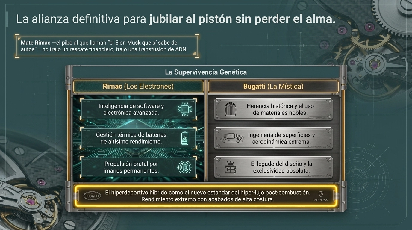 La fusión de Bugatti con Rimac no fue un matrimonio de conveniencia financiera, sino una necesidad de supervivencia genética. Rimac aporta los electrones y la inteligencia de software; Bugatti aporta la mística y la herencia de los materiales nobles. Como solemos debatir en AutoDonde, esta unión es un círculo que se cierra: el espíritu innovador de Ettore, que ya experimentaba con electricidad en los años 30, encuentra finalmente la tecnología capaz de estar a la altura de su apellido.