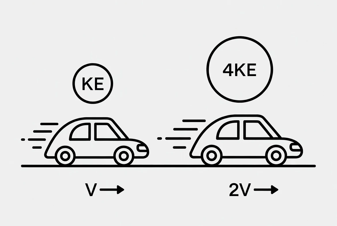 - Si vas a 50 km/h y acelerás a 100 km/h (duplicás la velocidad), la energía cinética se multiplica por $2^2 = **4$**.