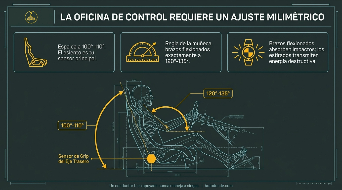 La mayoría de la gente se sube al auto y arranca. Error. Lo primero es el asiento. No es una reposera de playa. En la conducción dinámica, el asiento es tu sensor principal. La espalda debe estar completamente apoyada en el respaldo, formando un ángulo de unos 100 a 110 grados. ¿Por qué? Porque si estás muy recto, te cansás; si estás muy inclinado, perdés la sensibilidad de lo que hace el eje trasero del auto. Como siempre decimos en AutoDonde, la información del grip te llega por la espalda baja y la cola; si no estás bien apoyado, estás manejando a ciegas.