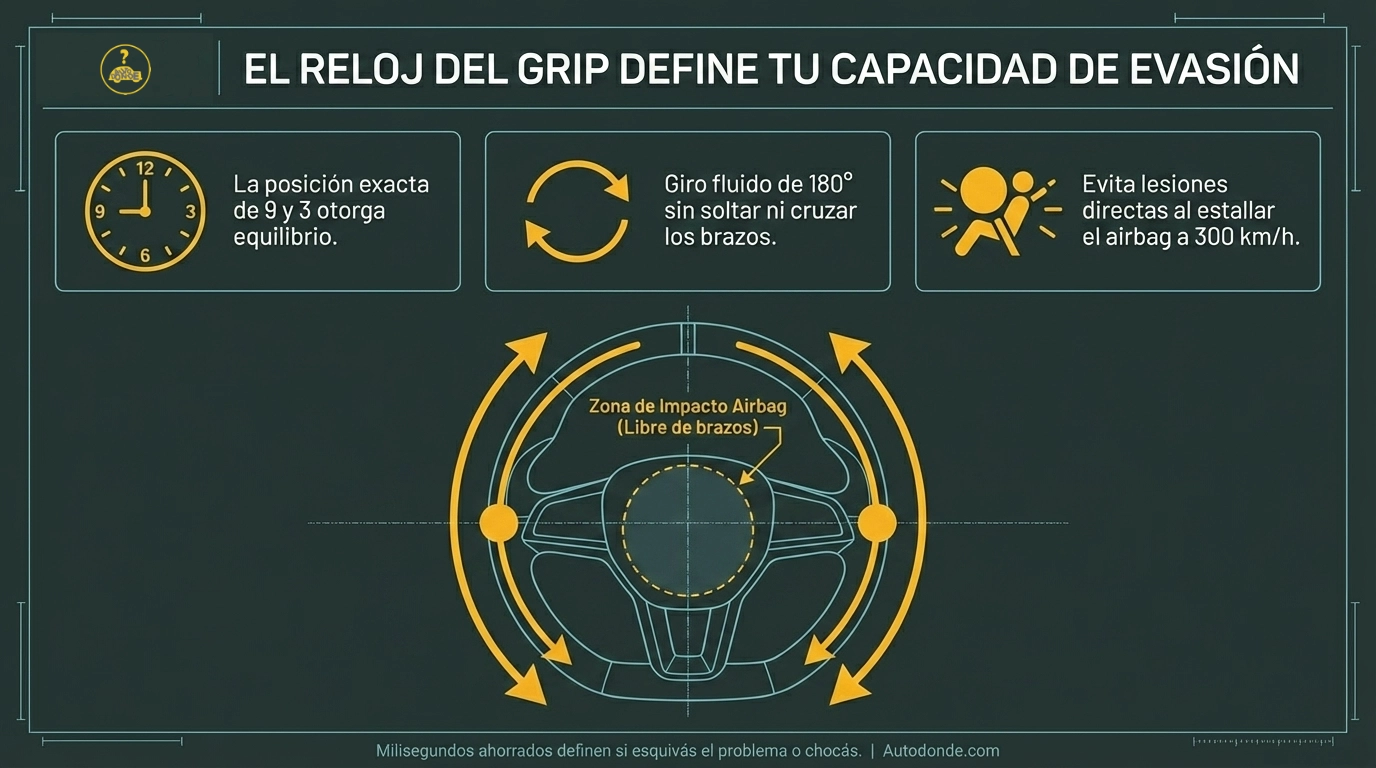 Además, está el tema del airbag. Si tenés las manos cruzadas o una mano a las 12 y el airbag explota (que lo hace a unos 300 km/h), tus propios brazos se van a convertir en proyectiles que van a ir directo a tu cara. En AutoDonde no enseñamos solo a ir rápido, enseñamos a sobrevivir a la física.
