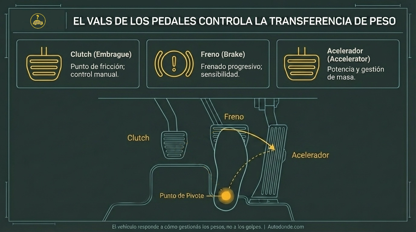 El pie derecho: El pivote Tu talón derecho debe estar siempre apoyado en el piso, justo en frente del freno, y pivotar hacia el acelerador. No levantes todo el pie para pasar de un pedal a otro; eso es lento y torpe. El freno se opera con «sensibilidad de cirujano» al principio y fuerza de hierro si es necesario, pero siempre de forma progresiva. Pisar el freno como si estuvieras matando una cucaracha solo bloquea las ruedas (o activa el ABS prematuramente) y desestabiliza la masa del vehículo.