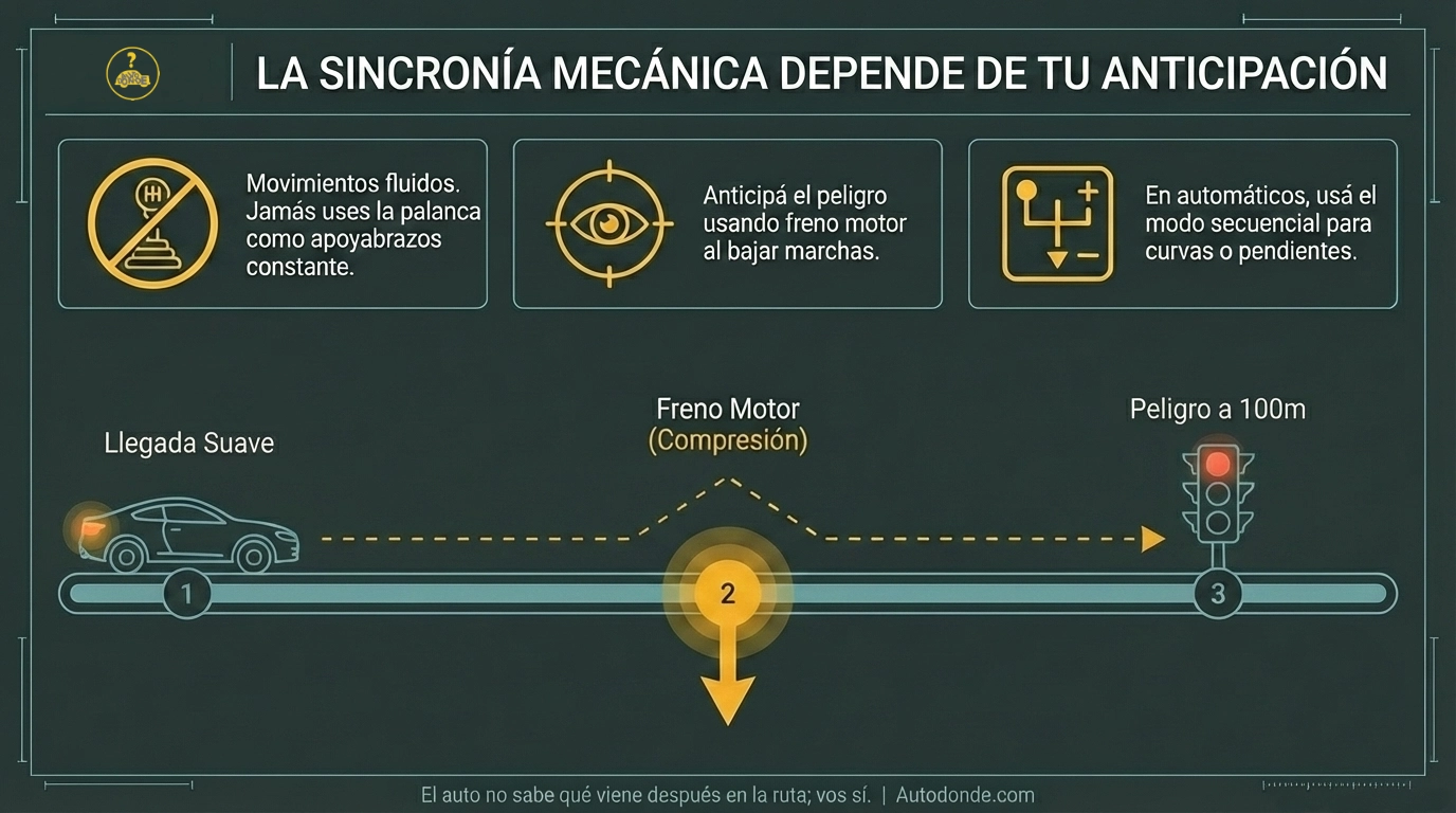 Ya sea que manejes un manual de seis marchas o un automático moderno, la lógica es la misma: eficiencia y protección de la mecánica.