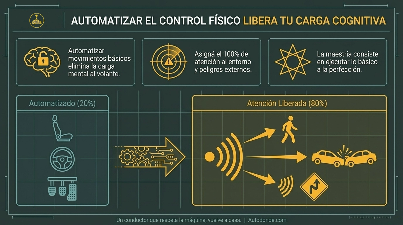 Automatizar estos movimientos te libera la cabeza. Si no tenés que pensar en cómo poner la mano o cómo soltar el embrague, podés dedicar el 100% de tu atención a lo que pasa en el entorno: ese nene que se asoma entre los autos estacionados, ese perro que cruza, o el conductor de adelante que viene distraído con el celular.